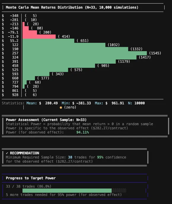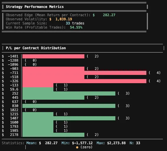 For this part, I’ll use a Python CLI tool I built specifically for the task (let me know if you’ll be interested in such tools and I might share them). The script uses a Monte Carlo analysis, sampling directly from the existing per-contract P/L distribution - without assuming normality.