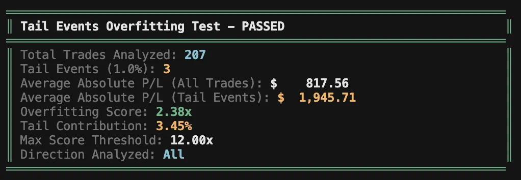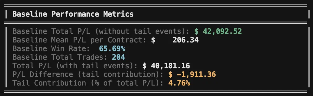 This shows the strategy is quite robust - even excluding the 1% tail events still leaves us with most of the profits and strong overall performance.
